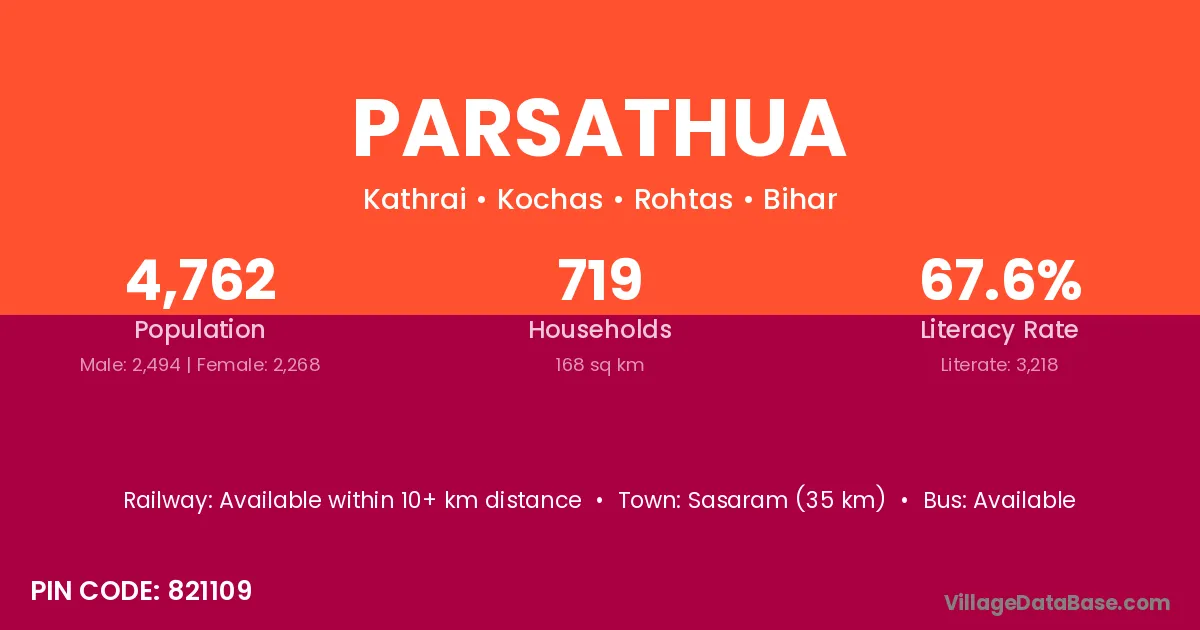 Sasaram (35 km) is the nearest town to Parsathua village for major economic activities and is located approximately 35 km away.