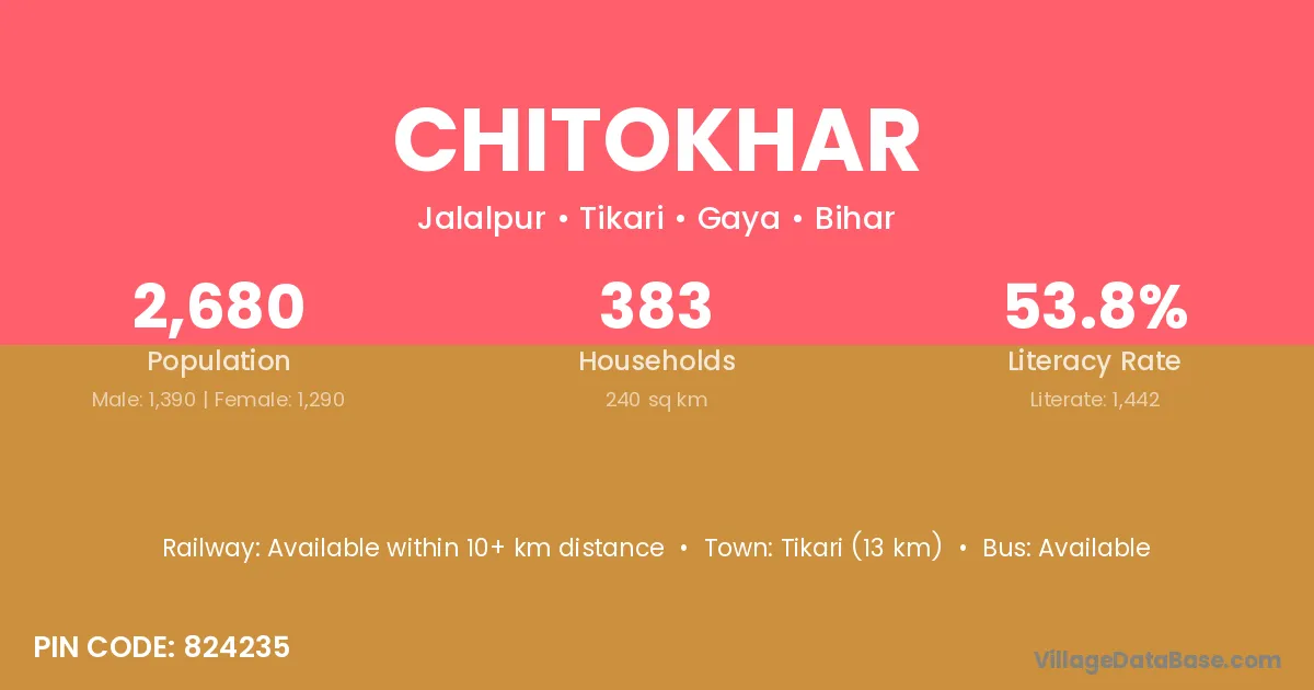 Chitokhar village has a total population of 1,509 people, of which 781 are males and 728 are females.