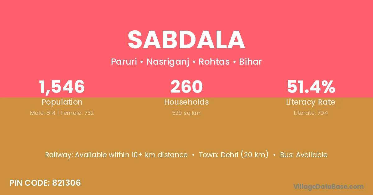 Dehri (20 km) is the nearest town to Sabdala village for major economic activities and is located approximately 20 km away.