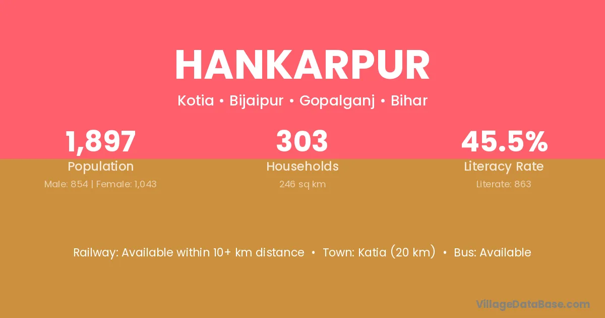 Hankarpur village has a total population of 480 people, of which 244 are males and 236 are females.