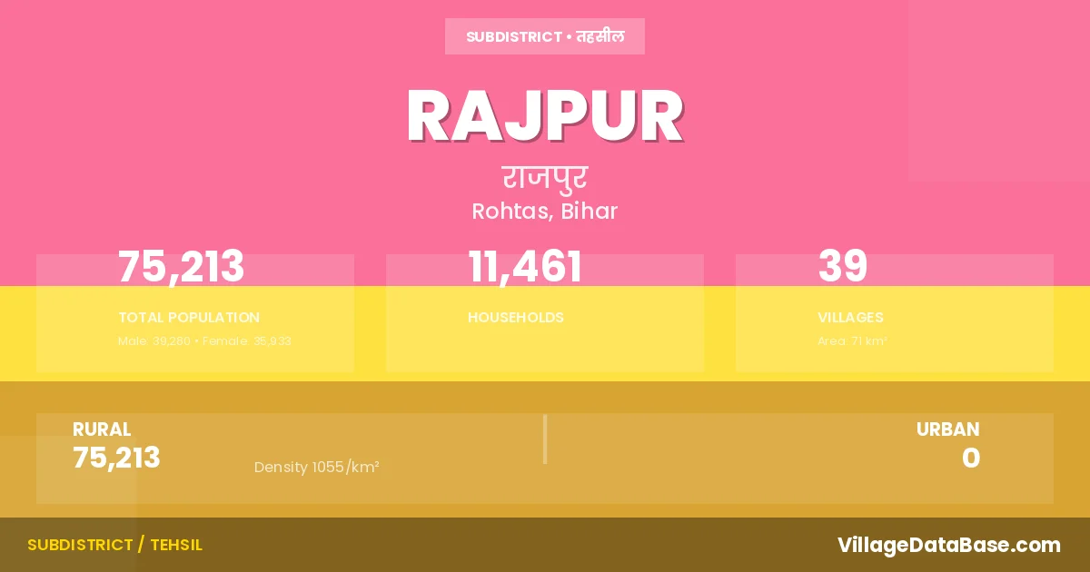 Rajpur is a town and Subdivision in the Rohtas district of the Bihar. In India, a Subdivision is a subdivision of a district responsible for the administration and revenue collection of a specific area within the district. Subdivisions play a crucial role in the local governance structure, contributing significantly to the development and administration of their communities.