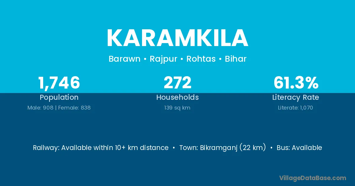 Bikramganj (22 km) is the nearest town to Karamkila village for major economic activities and is located approximately 22 km away.
