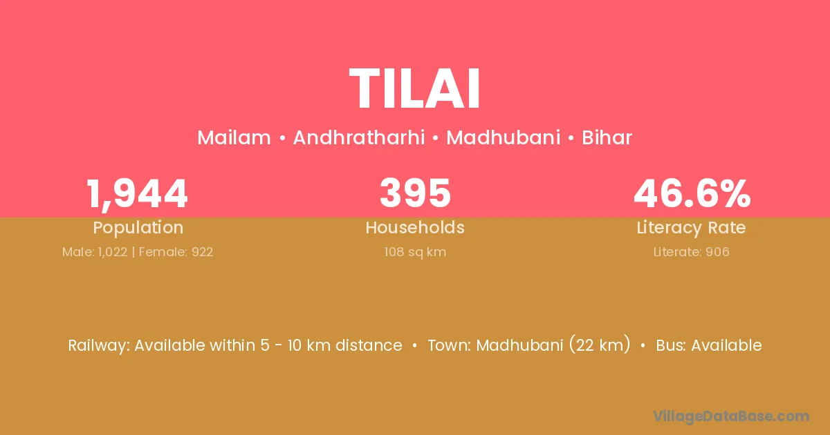 The literacy rate of Tilai village is 64.35%. Male literacy stands at 72.69% and female literacy at 54.99%.