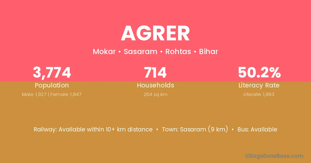 Sasaram (9 km) is the nearest town to Agrer village for major economic activities and is located approximately 9 km away.