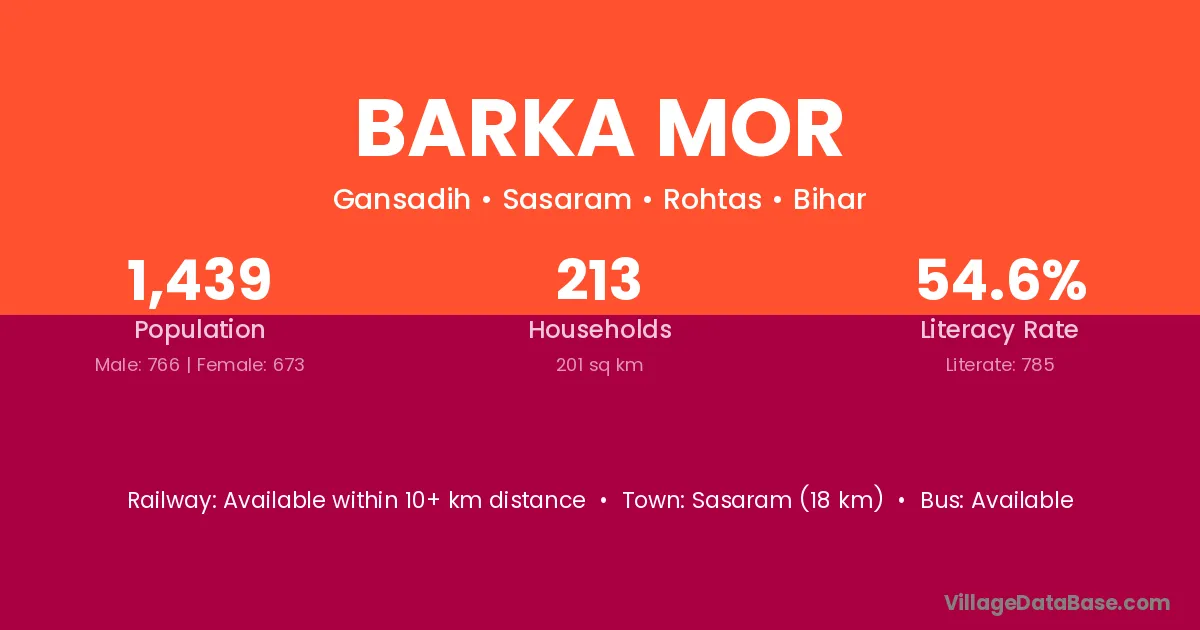 Sasaram (18 km) is the nearest town to Barka Mor village for major economic activities and is located approximately 18 km away.