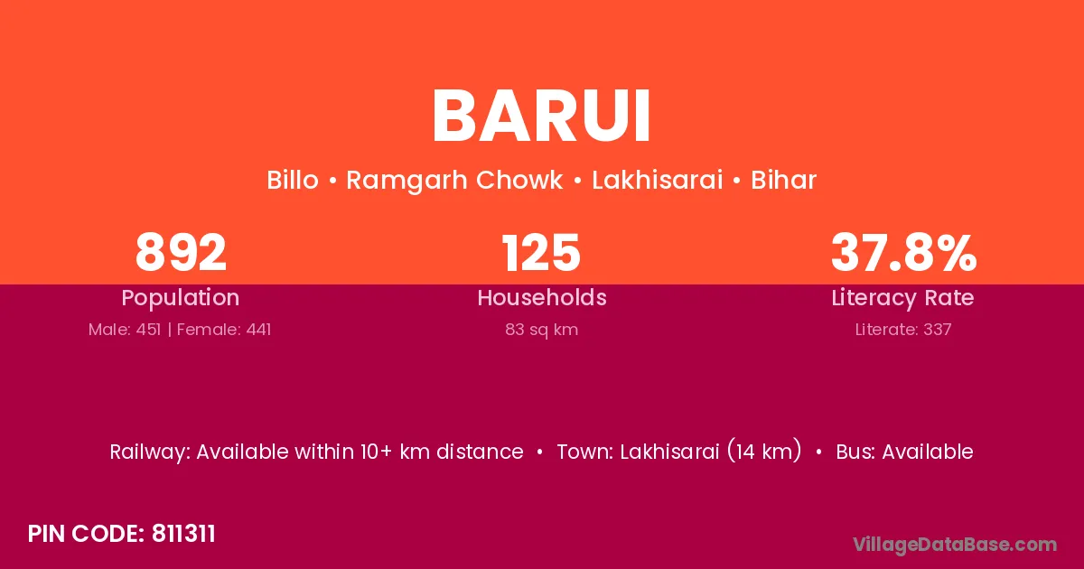 Sasaram (15 km) is the nearest town to Barui village for major economic activities and is located approximately 15 km away.