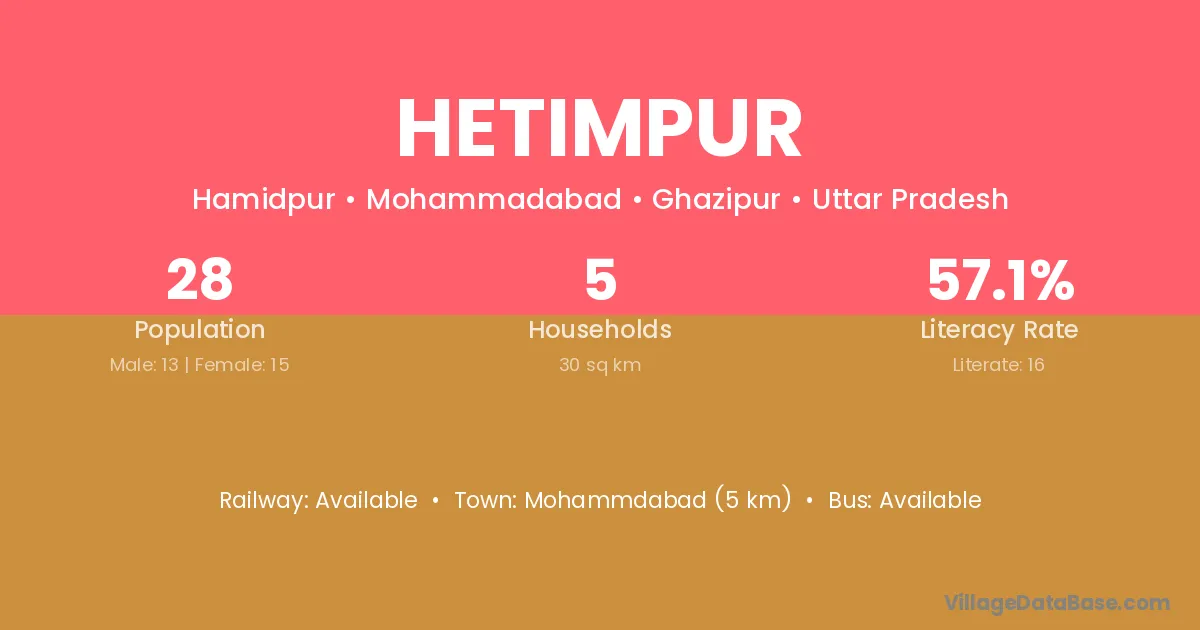 The literacy rate of Hetimpur village is 35.38%. Male literacy stands at 39.39% and female literacy at 31.27%.