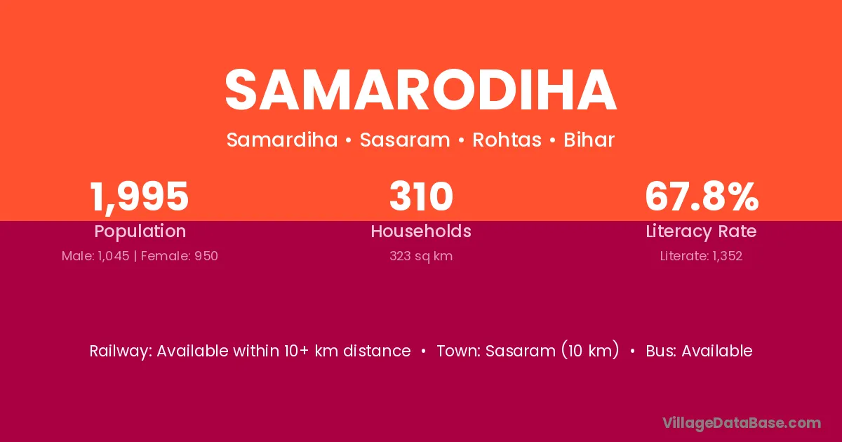 Samarodiha village has a total population of 1,995 people, of which 1,045 are males and 950 are females.