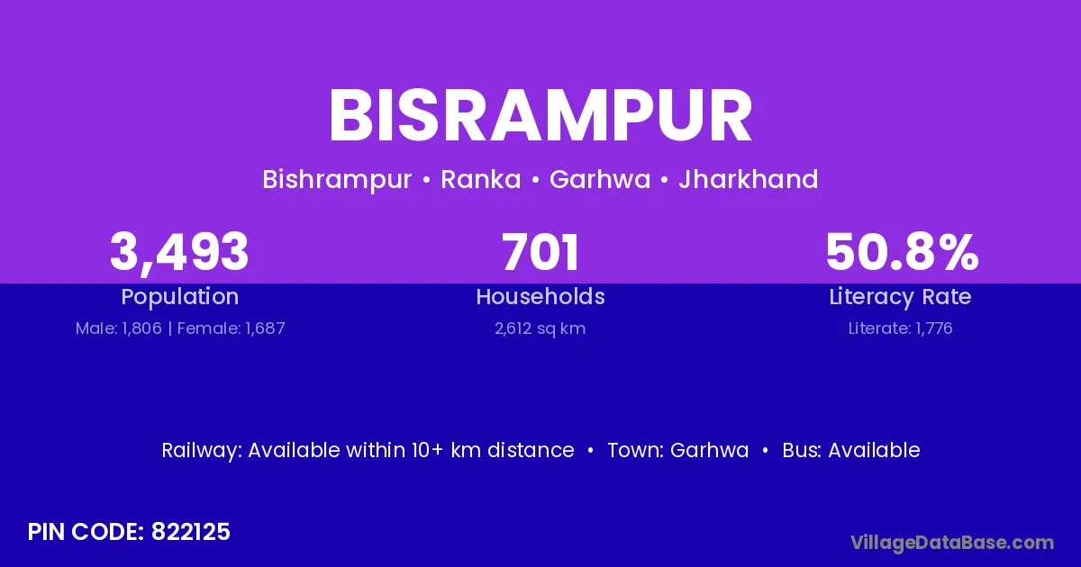 Sasaram (28 km) is the nearest town to Bisrampur village for major economic activities and is located approximately 28 km away.