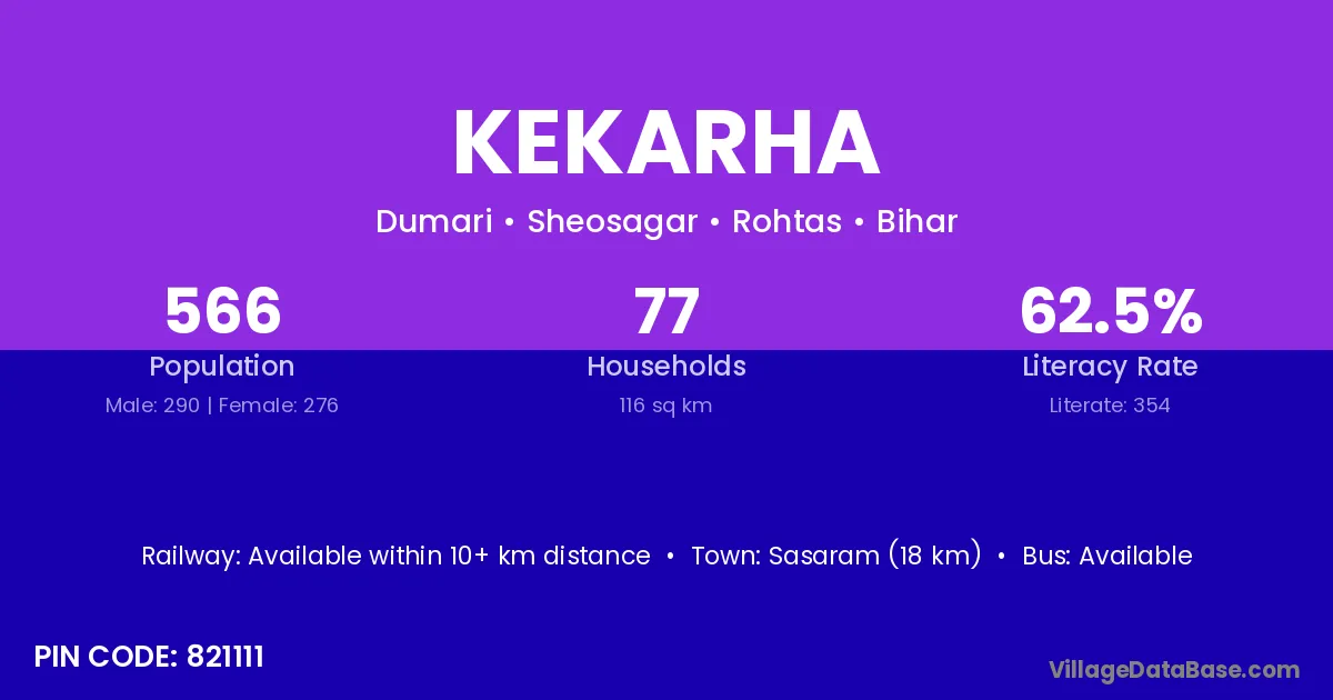 Sasaram (18 km) is the nearest town to Kekarha village for major economic activities and is located approximately 18 km away.
