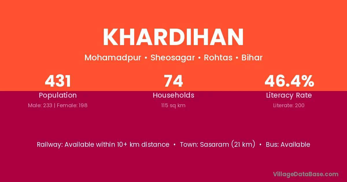 Sasaram (21 km) is the nearest town to Khardihan village for major economic activities and is located approximately 21 km away.