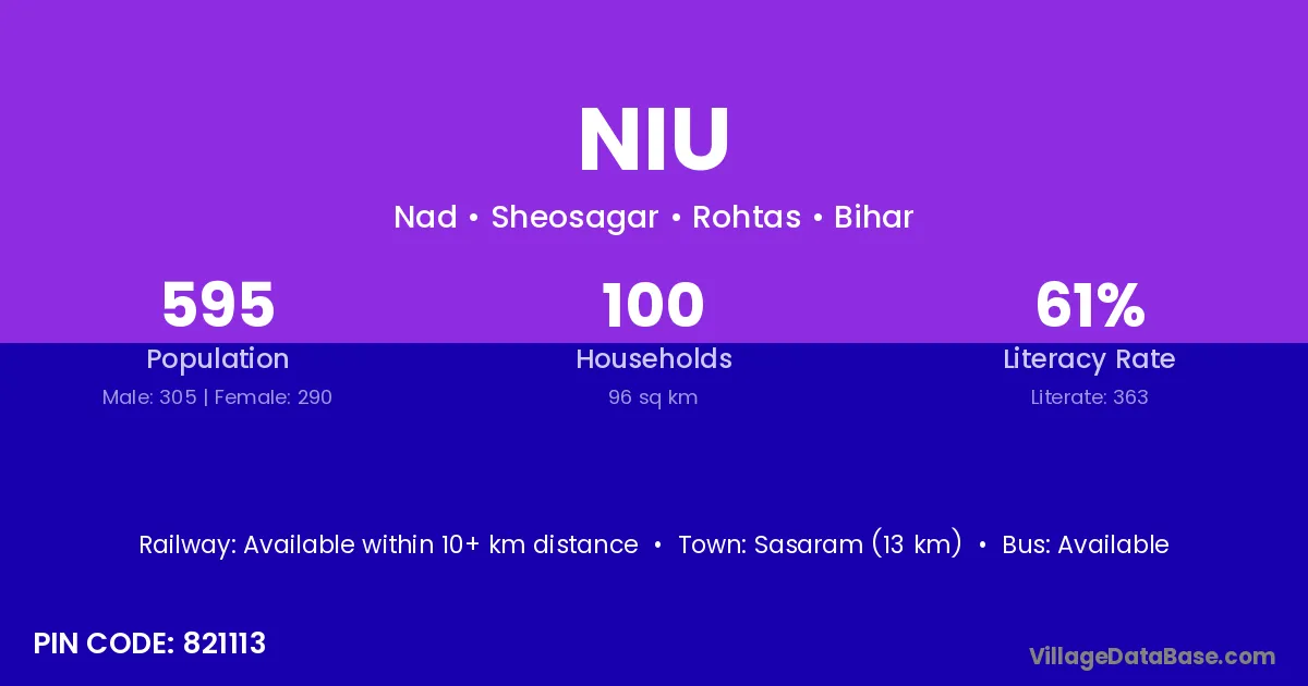 Sasaram (13 km) is the nearest town to Niu village for major economic activities and is located approximately 13 km away.