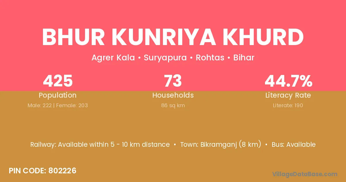 Bikramganj (8 km) is the nearest town to Bhur Kunriya Khurd village for major economic activities and is located approximately 8 km away.
