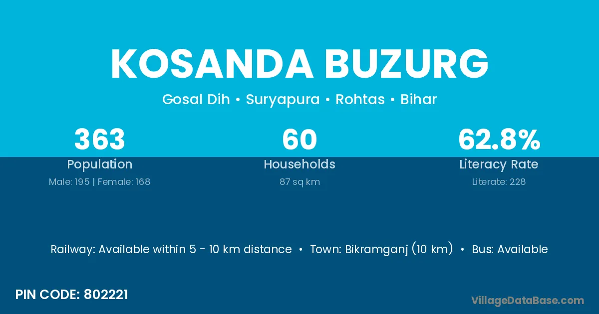 Bikramganj (10 km) is the nearest town to Kosanda Buzurg village for major economic activities and is located approximately 10 km away.