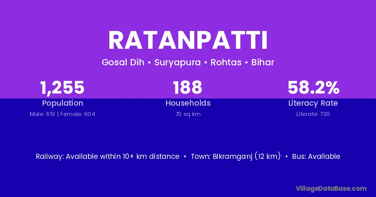 Bikramganj (12 km) is the nearest town to Ratanpatti village for major economic activities and is located approximately 12 km away.