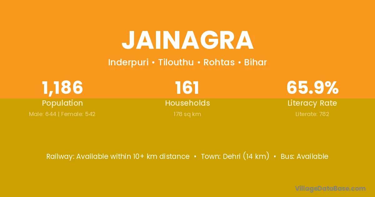 Dehri (14 km) is the nearest town to Jainagra village for major economic activities and is located approximately 14 km away.