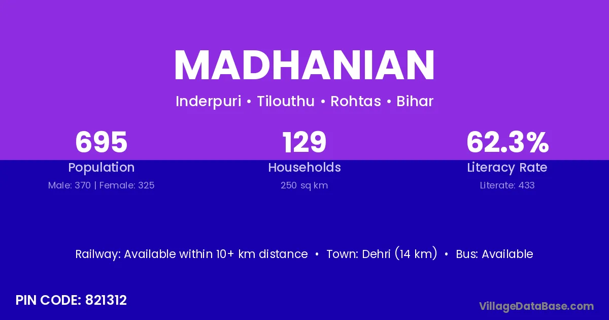 Dehri (14 km) is the nearest town to Madhanian village for major economic activities and is located approximately 14 km away.