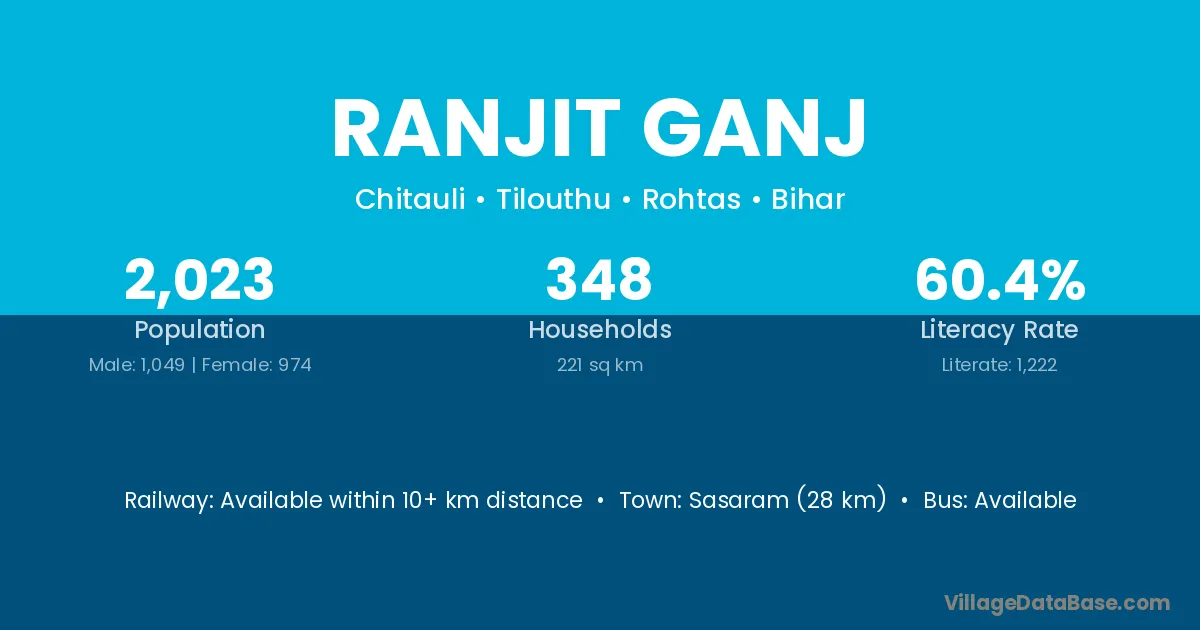 Sasaram (28 km) is the nearest town to Ranjit Ganj village for major economic activities and is located approximately 28 km away.