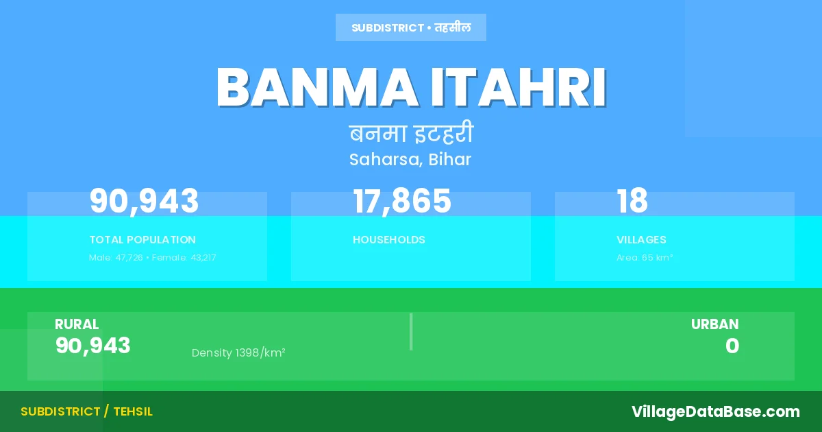 Banma Itahri is a town and Subdivision in the Saharsa district of the Bihar. In India, a Subdivision is a subdivision of a district responsible for the administration and revenue collection of a specific area within the district. Subdivisions play a crucial role in the local governance structure, contributing significantly to the development and administration of their communities.