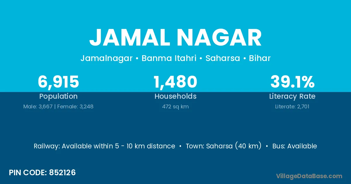 Saharsa (40 km) is the nearest town to Jamal Nagar village for major economic activities and is located approximately 40 km away.
