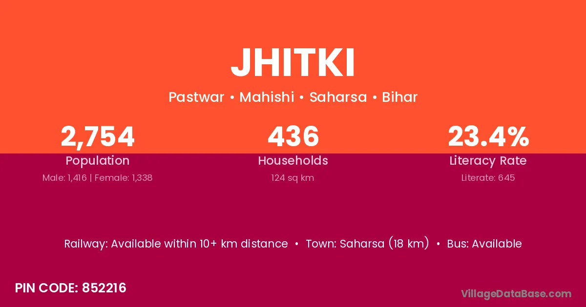 Saharsa (18 km) is the nearest town to Jhitki village for major economic activities and is located approximately 18 km away.