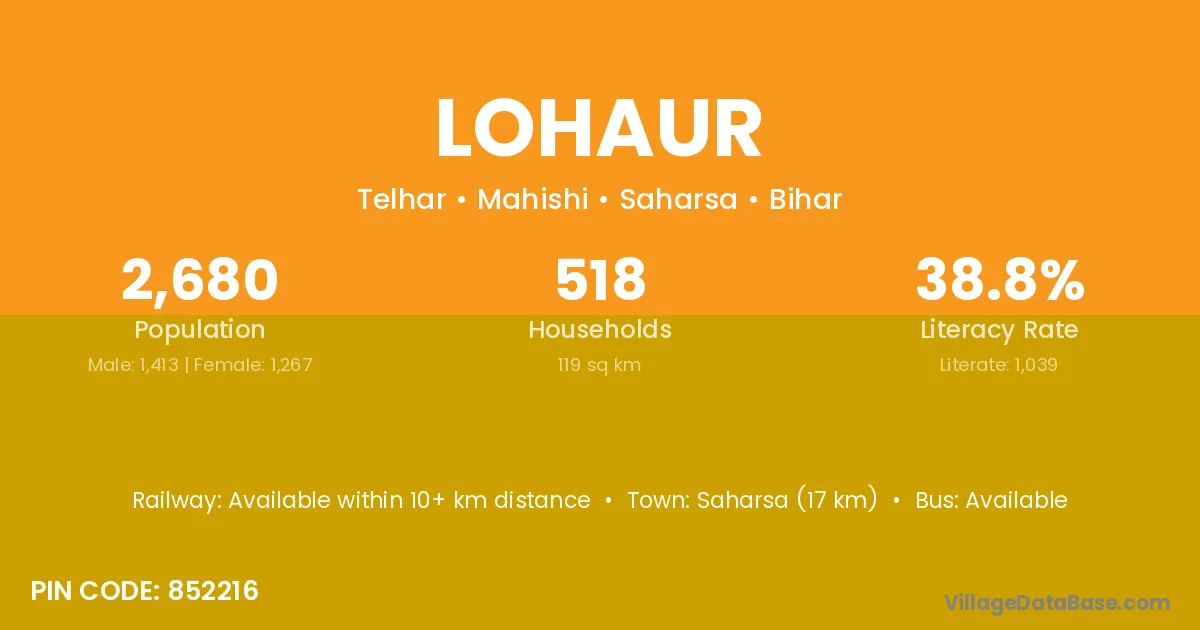Saharsa (17 km) is the nearest town to Lohaur village for major economic activities and is located approximately 17 km away.
