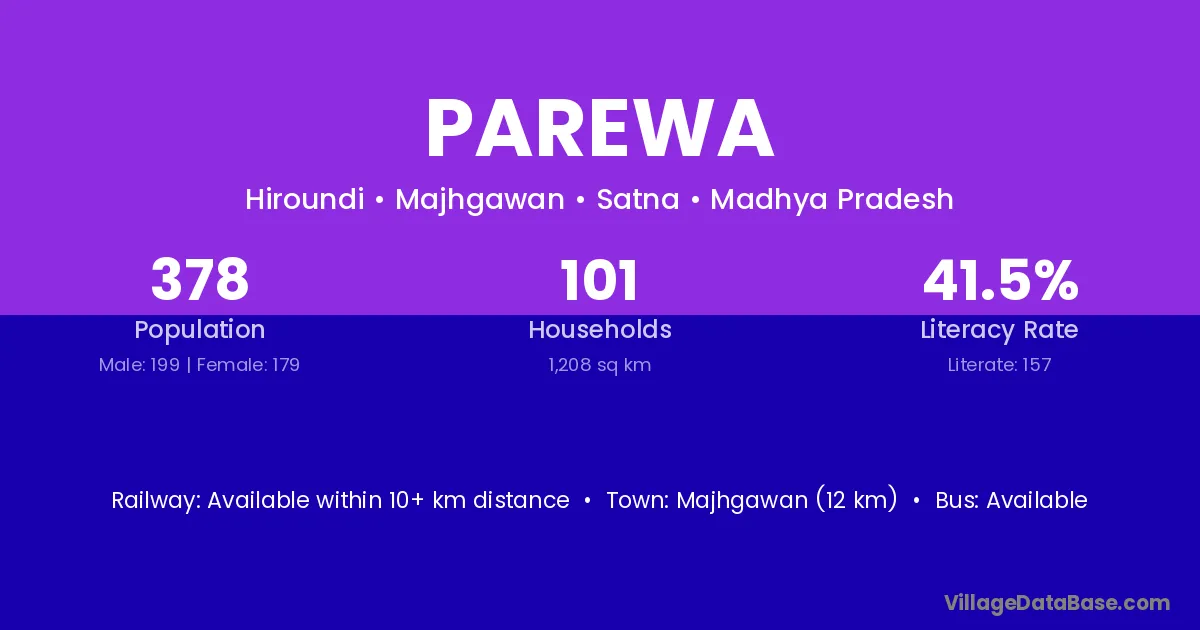 Parewa village has a total population of 202 people, of which 106 are males and 96 are females.