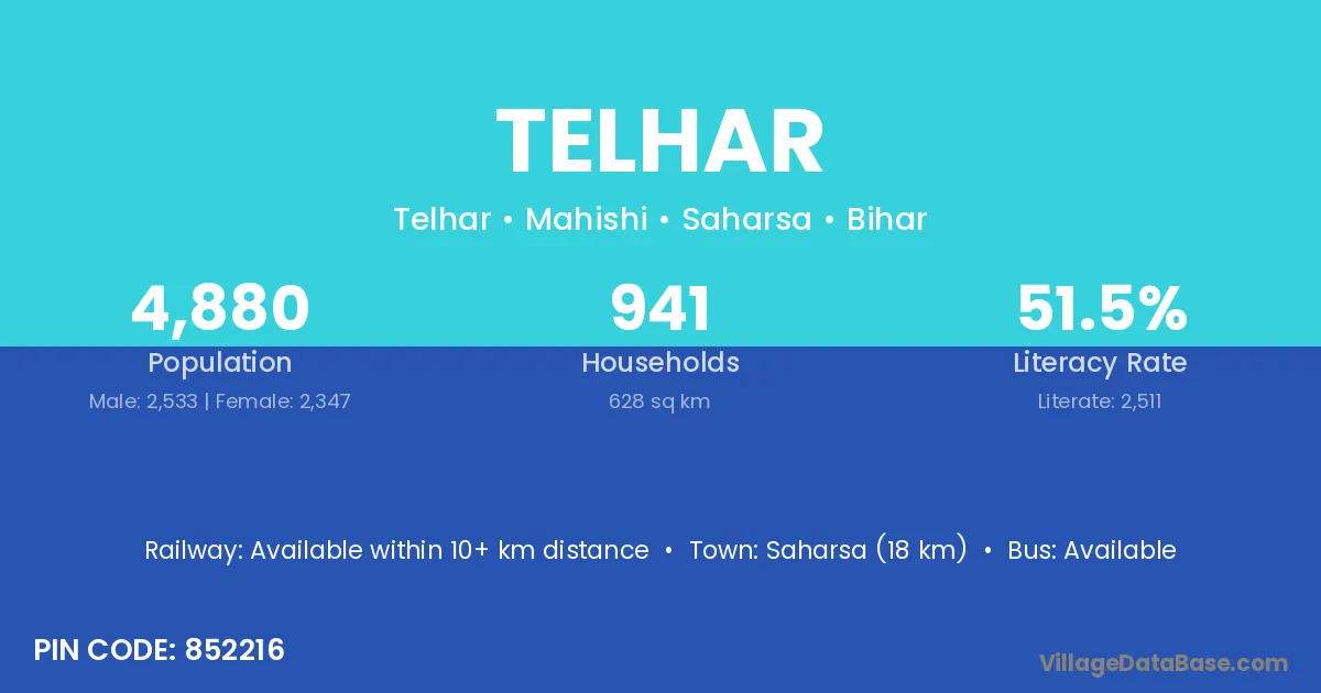 Saharsa (18 km) is the nearest town to Telhar village for major economic activities and is located approximately 18 km away.