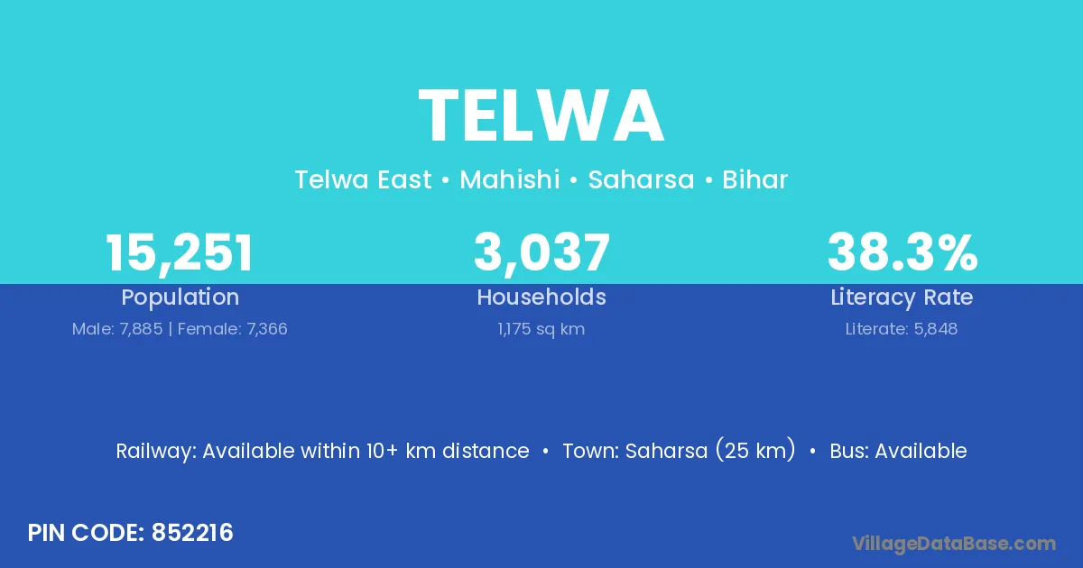Saharsa (25 km) is the nearest town to Telwa village for major economic activities and is located approximately 25 km away.