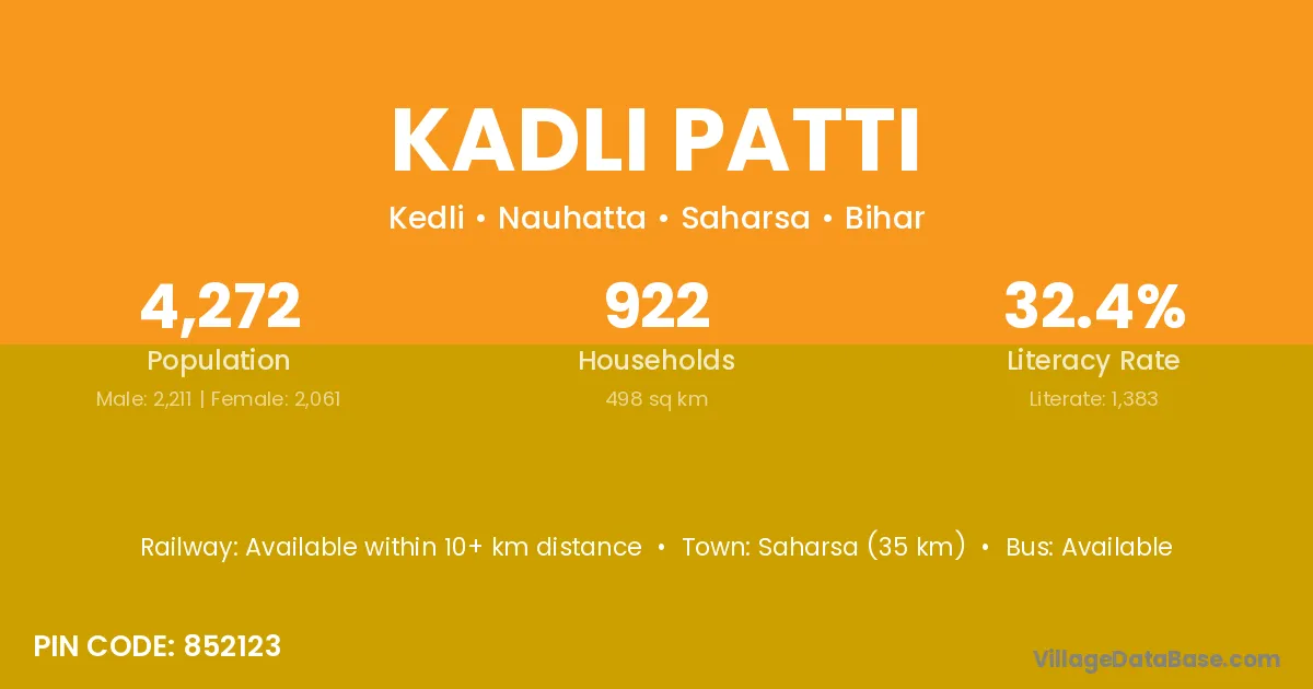 Saharsa (35 km) is the nearest town to Kadli Patti village for major economic activities and is located approximately 35 km away.