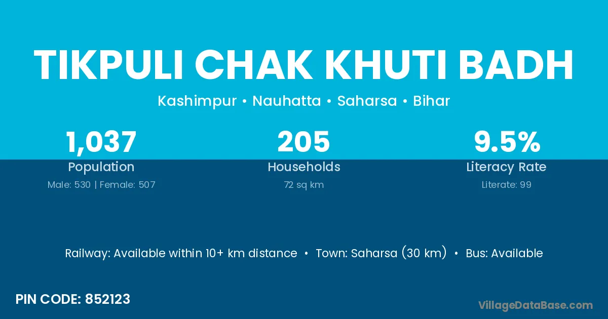 Saharsa (30 km) is the nearest town to Tikpuli Chak Khuti Badh village for major economic activities and is located approximately 30 km away.