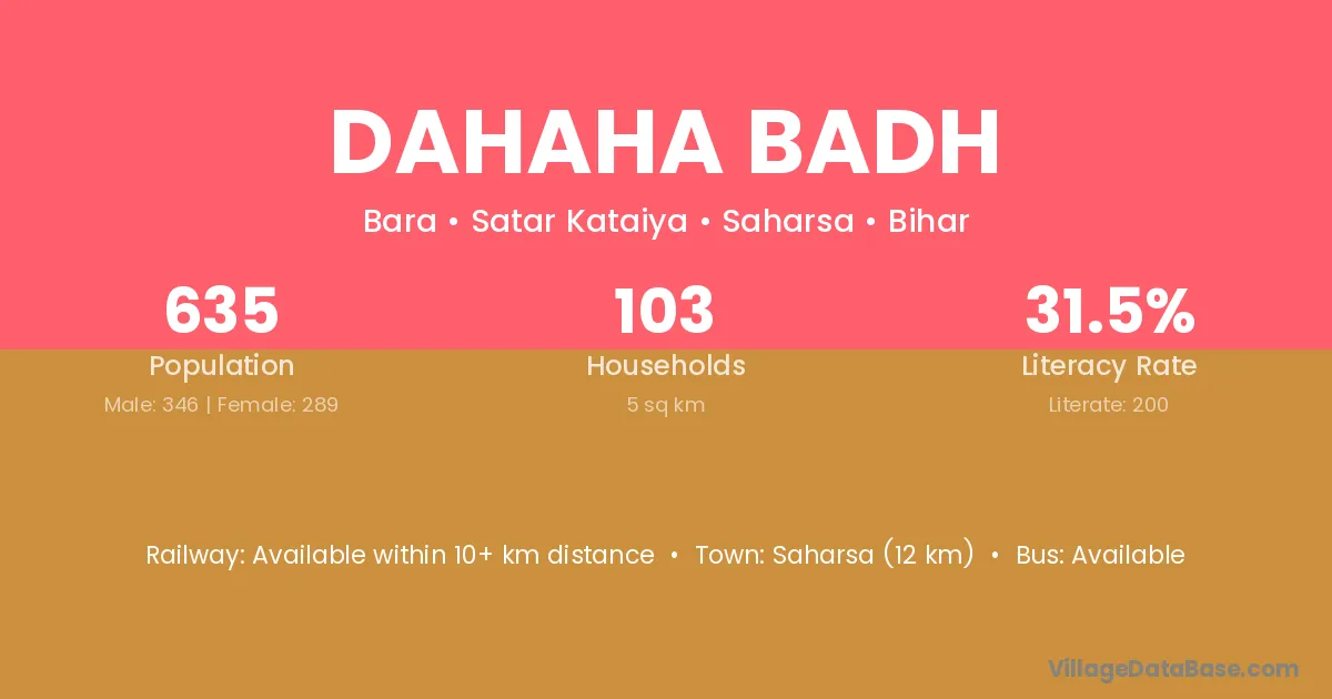 Saharsa (12 km) is the nearest town to Dahaha Badh village for major economic activities and is located approximately 12 km away.