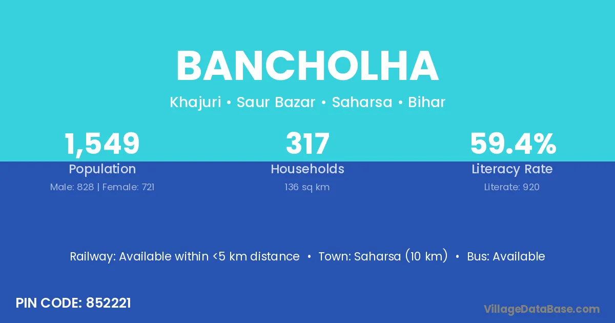 Saharsa (10 km) is the nearest town to Bancholha village for major economic activities and is located approximately 10 km away.