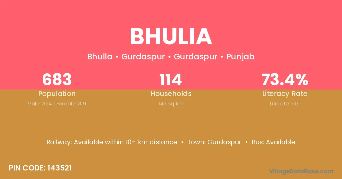 The literacy rate of Bhulia village is 44.38%. Male literacy stands at 61.60% and female literacy at 28.17%.