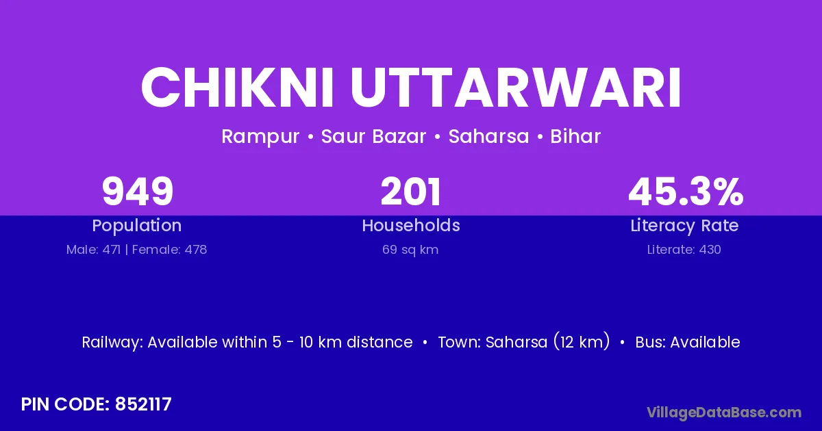 Saharsa (12 km) is the nearest town to Chikni Uttarwari village for major economic activities and is located approximately 12 km away.
