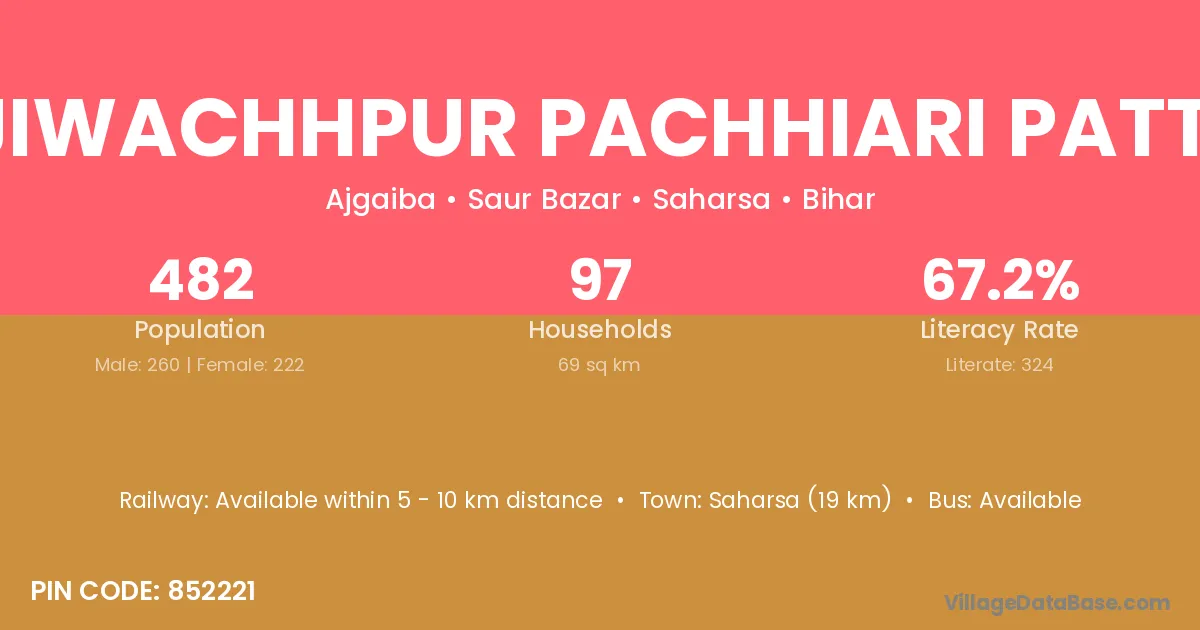 Jiwachhpur Pachhiari Patti village has a total population of 482 people, of which 260 are males and 222 are females.