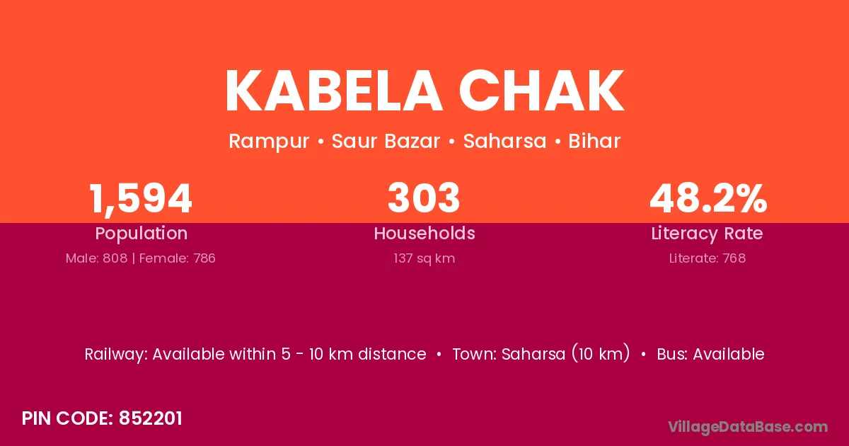 Saharsa (10 km) is the nearest town to Kabela Chak village for major economic activities and is located approximately 10 km away.