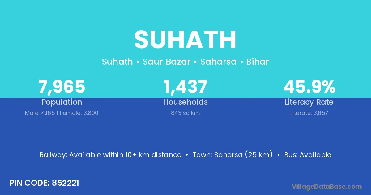 Saharsa (25 km) is the nearest town to Suhath village for major economic activities and is located approximately 25 km away.