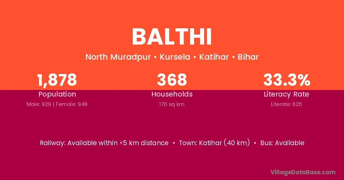 The literacy rate of Balthi village is 50.23%. Male literacy stands at 59.78% and female literacy at 39.47%.