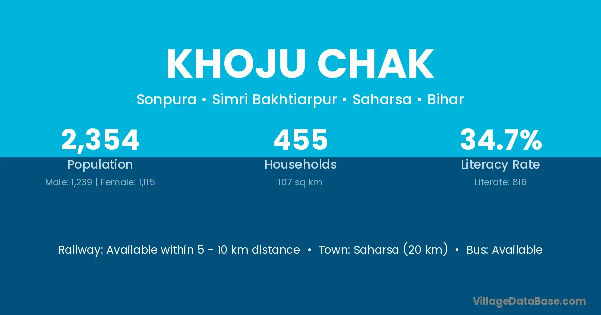 Saharsa (20 km) is the nearest town to Khoju Chak village for major economic activities and is located approximately 20 km away.