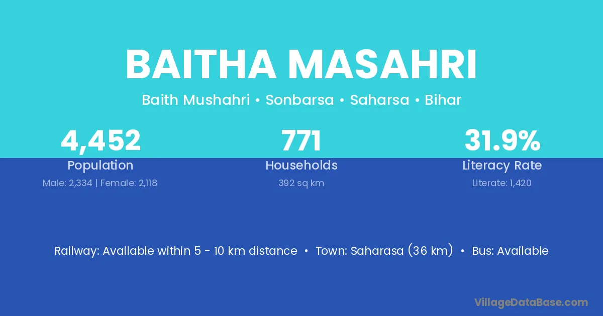 Saharasa (36 km) is the nearest town to Baitha Masahri village for major economic activities and is located approximately 36 km away.