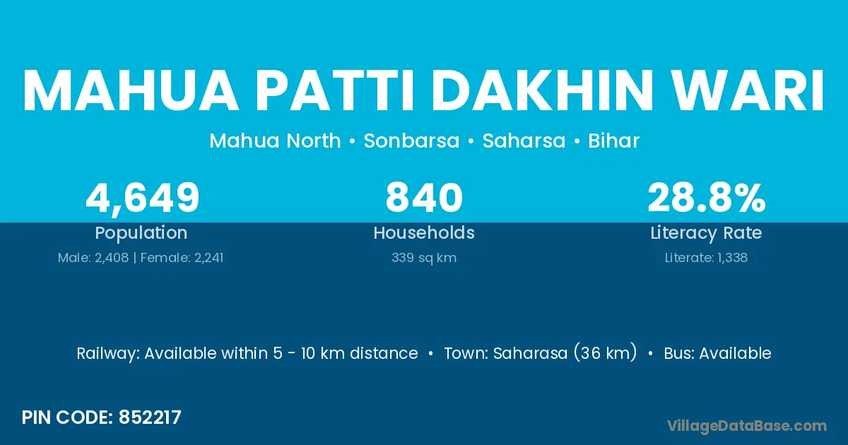 Saharasa (36 km) is the nearest town to Mahua Patti Dakhin Wari village for major economic activities and is located approximately 36 km away.