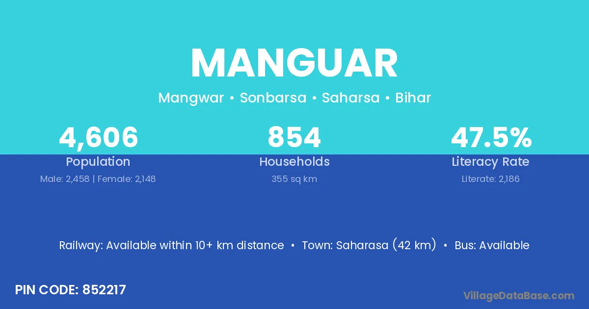 Saharasa (42 km) is the nearest town to Manguar village for major economic activities and is located approximately 42 km away.