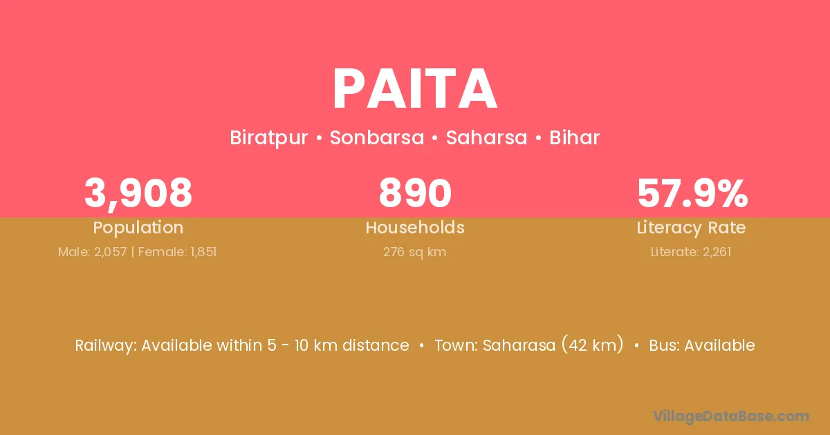 Saharasa (42 km) is the nearest town to Paita village for major economic activities and is located approximately 42 km away.