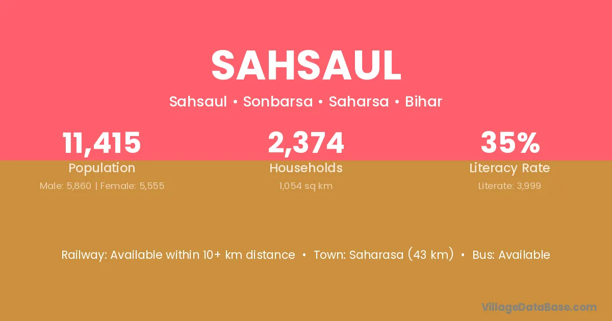 Saharasa (43 km) is the nearest town to Sahsaul village for major economic activities and is located approximately 43 km away.