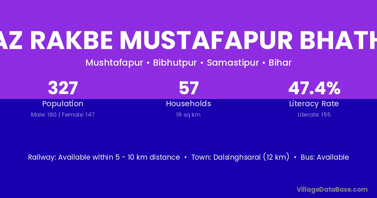 Dalsinghsarai (12 km) is the nearest town to Az Rakbe Mustafapur Bhath village for major economic activities and is located approximately 12 km away.
