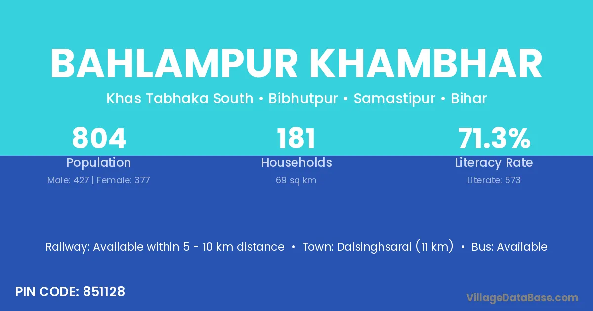 Dalsinghsarai (11 km) is the nearest town to Bahlampur Khambhar village for major economic activities and is located approximately 11 km away.