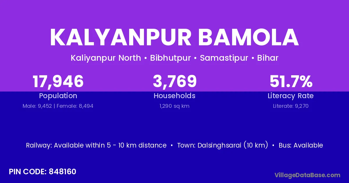 Dalsinghsarai (10 km) is the nearest town to Kalyanpur Bamola village for major economic activities and is located approximately 10 km away.
