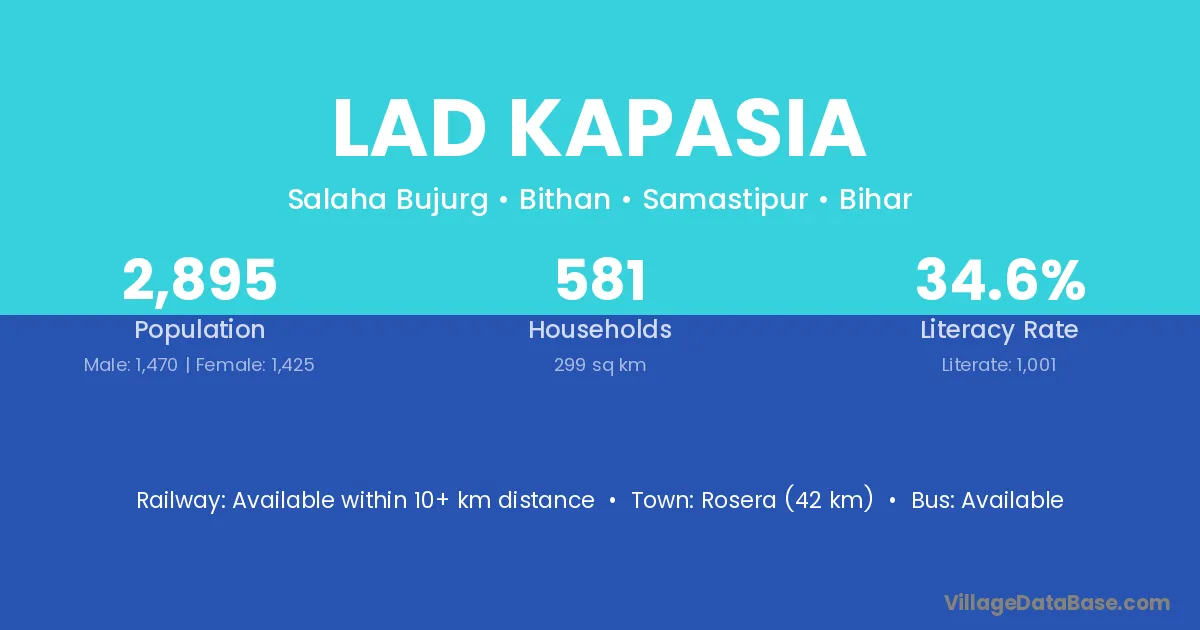 Lad Kapasia village has a total population of 2,895 people, of which 1,470 are males and 1,425 are females.