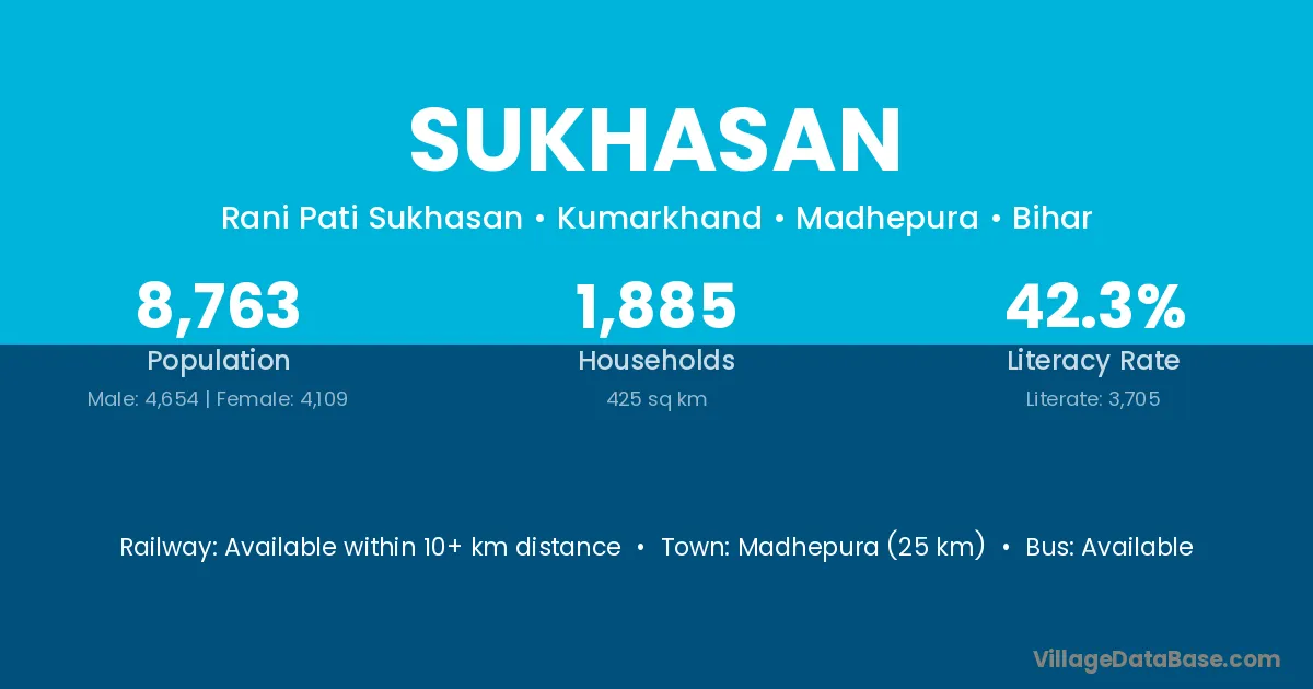 Rosera (40 km) is the nearest town to Sukhasan village for major economic activities and is located approximately 40 km away.